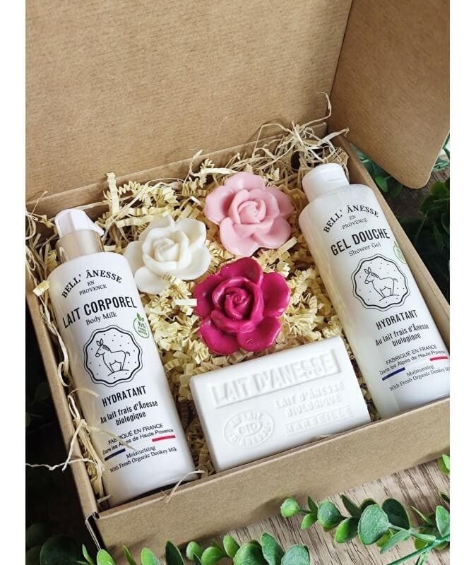La Box Évasion lait d’ânesse contient un lait corporel, un gel douche, un savon au lait d'ânesse, et trois savons roses. Ce coffret offre une routine complète pour nettoyer, hydrater et apaiser la peau grâce aux bienfaits naturels du lait d’ânesse. Une idée cadeau idéale pour un moment de détente et de douceur.