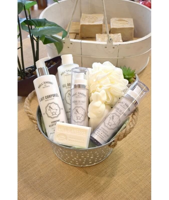 La Coffret « Éclat » au Lait d’Ânesse Bio rassemble une routine complète visage et corps : lait corporel, gel douche, crèmes de jour / de nuit, savons, fleur de douche et corbeille en zinc. Formulés à base de lait d’ânesse bio riche en vitamines et acides gras essentiels, ces soins hydratent, régénèrent et apaisent les peaux sensibles tout en offrant une expérience sensorielle raffinée. Idéal comme cadeau bien-être, prêt à être offert.