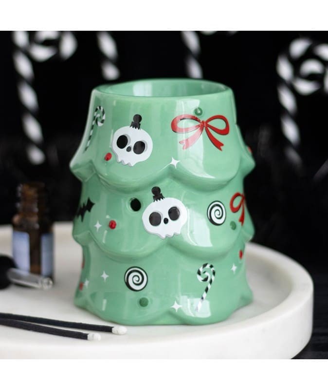 Apportez une touche de charme effrayant à votre décoration de Noël avec ce brûleur à huile et à cire en forme de sapin de Noël orné de cannes de bonbon, de crânes et de nœuds effrayants. Idéal pour ceux qui aiment Noël avec ses cris et une touche ludique aux décorations festives traditionnelles.