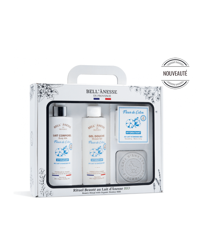 - Fleur de coton : Lait corporel et gel douche fleur de coton, Savon au lait d'ânesse fleur de coton
