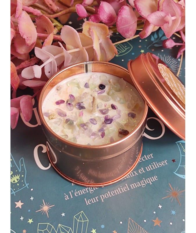 Cette bougie artisanale est conçue pour apporter une harmonie unique à votre espace, en alliant les bienfaits de la lithothérapie à la douce lueur d'une flamme.
