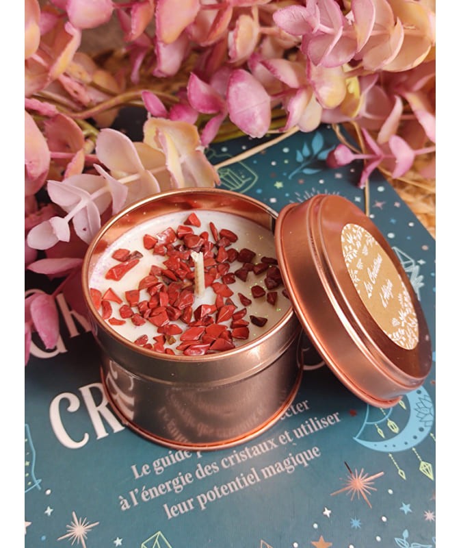 Cette bougie artisanale est conçue pour apporter une harmonie unique à votre espace, en alliant les bienfaits de la lithothérapie à la douce lueur d'une flamme.