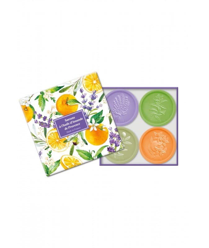4 savons de 25 gr senteurs : Lavande, Verveine, Fleur d'Oranger, Fleur d'Olivier