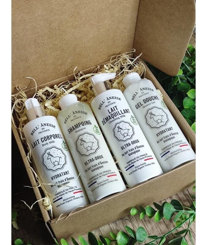 La box réunit quatre soins indispensables, tous enrichis en lait d’ânesse, pour une expérience bien-être à la fois douce et efficace.